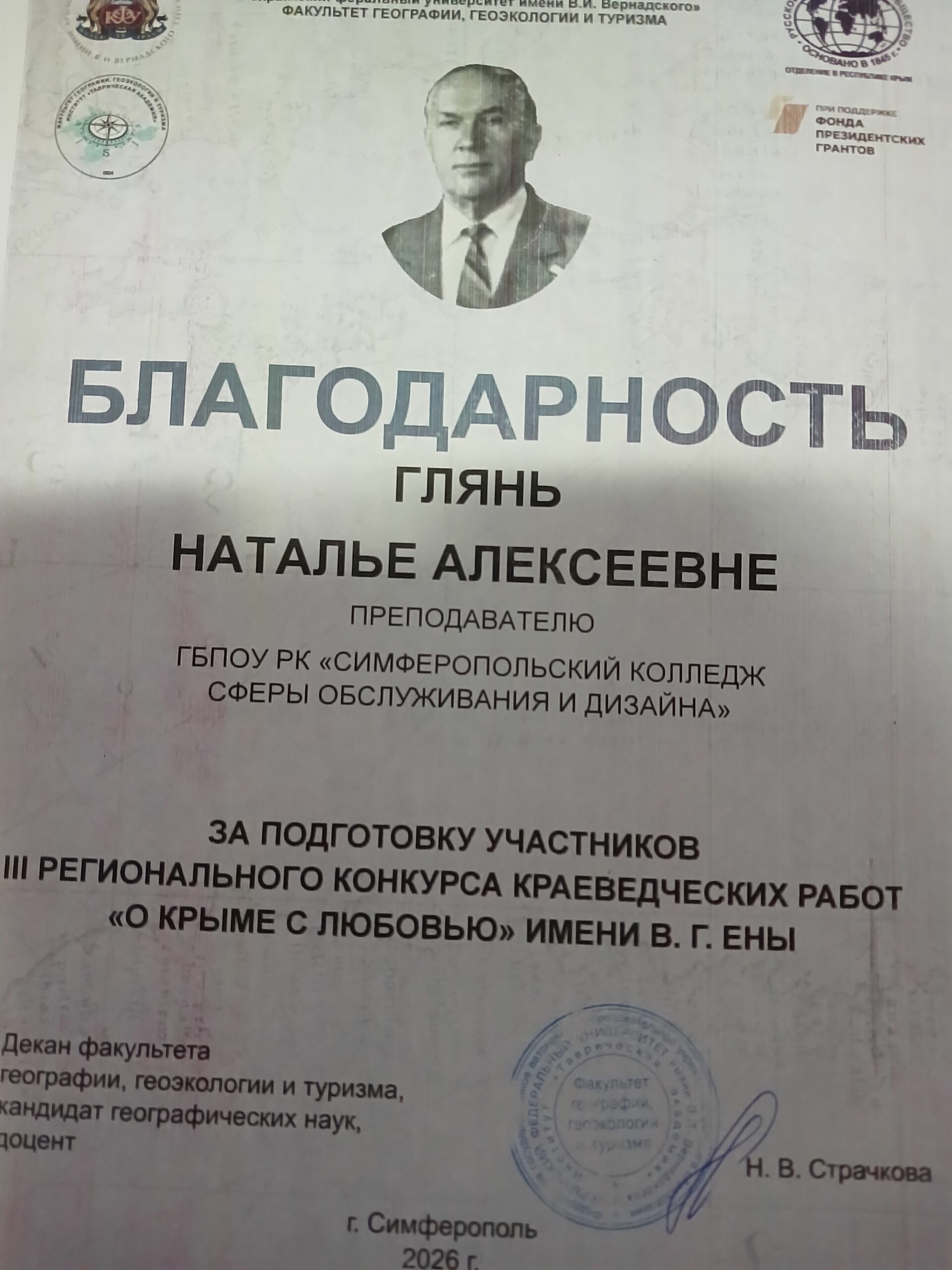 28 марта преподаватель географии Глянь Н.А. и обучающаяся 715 группы Коккоева Маргарита приняли участие в торжественном награждении победителей III Регионального конкурса краеведческих работ «О Крыме с любовью» имени В. Г. Ены.